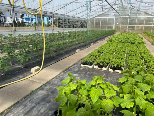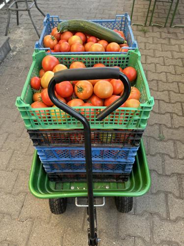 Wir haben wieder veredelte Gurkenpflanzen, Tomatenpflanzen und Salat, Kohlrabi aus eigener Produktion.