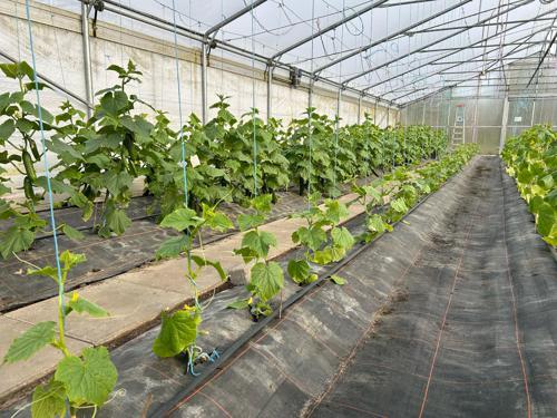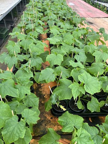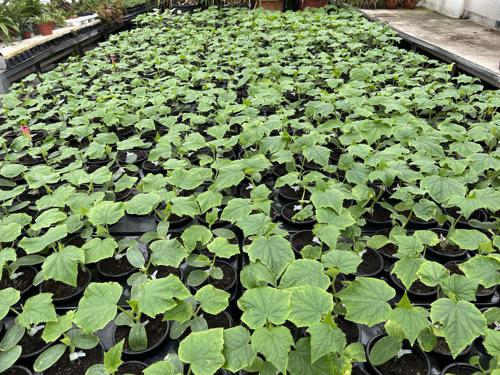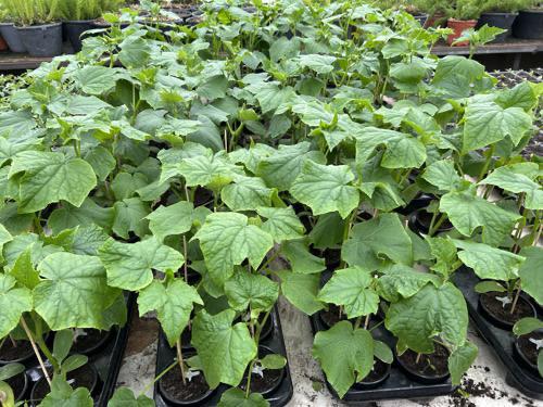 Wir haben wieder veredelte Gurkenpflanzen, Tomatenpflanzen und Salat, Kohlrabi aus eigener Produktion.